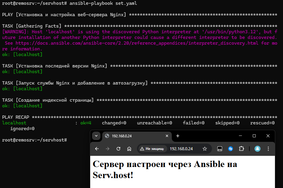 Если Nginx уже установлен, Ansible просто пропустит этот шаг. Если файл index.html уже совпадает с тем, что вы указали, он не будет его перезаписывать. Это делает автоматизацию безопасной - вы не «сломаете» уже настроенный сервер повторным запуском сценария.